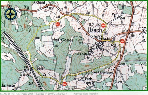 De la Mairie d'Uzech, se diriger vers le cimetière en traversant la D5 puis en passant devant la poterie.